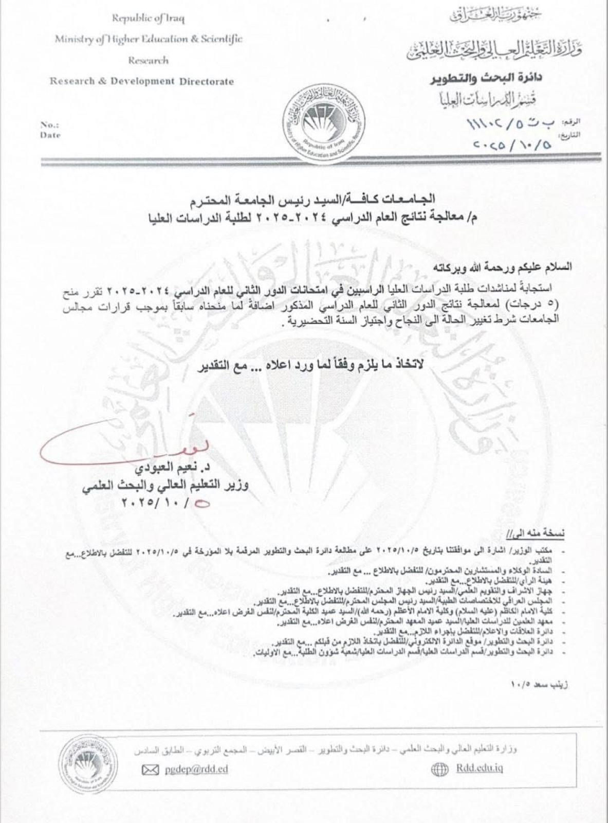 وزارة التعليم تقرر منح 5 درجات لطلبة الدراسات العليا الراسبين بالدور الثاني