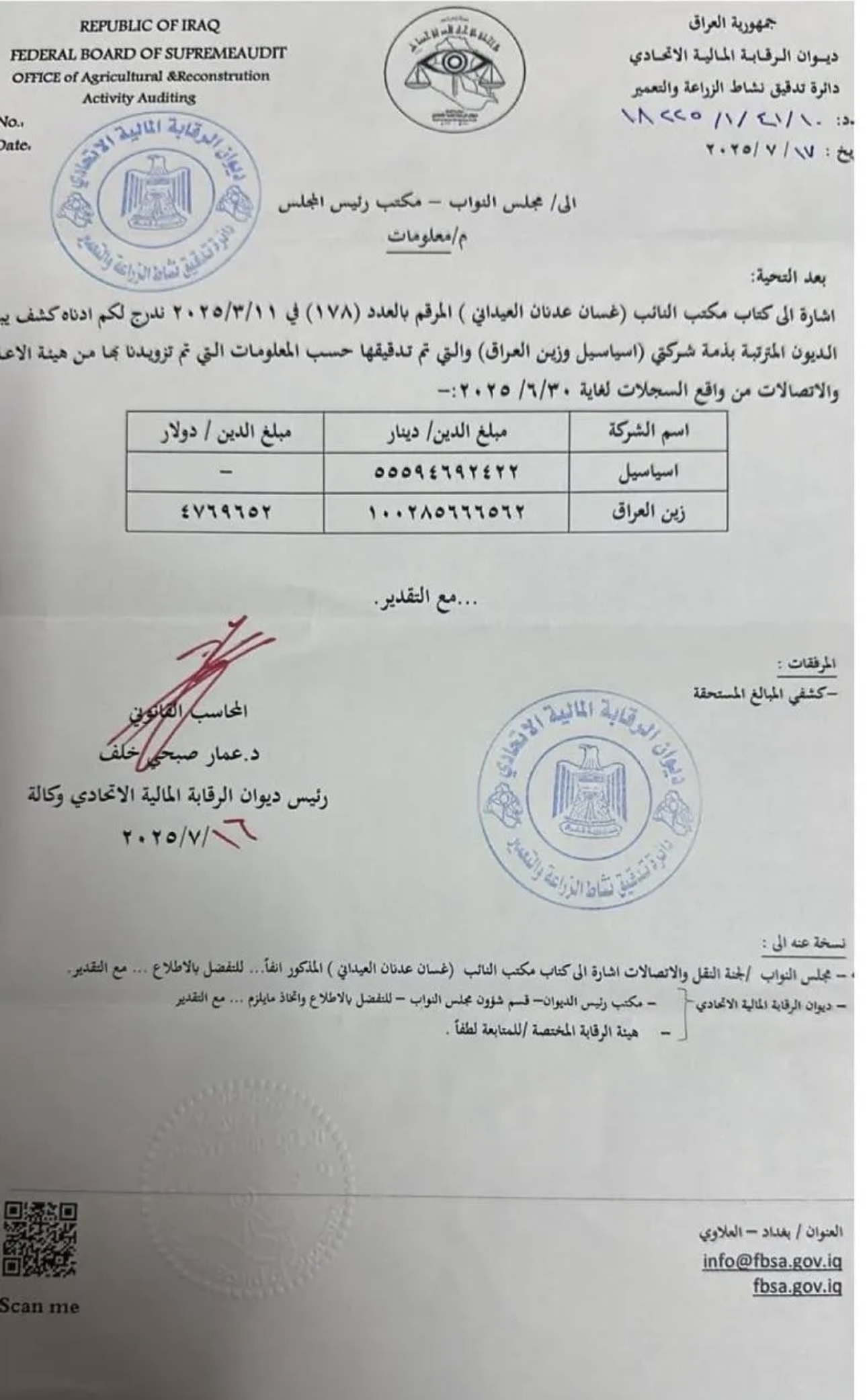 وبحسب الوثيقة، الموجهة إلى مجلس النواب، فإن ديون الشركتين، ولغاية 30 حزيران/ يونيو الماضي، بلغت على اسياسيل أكثر من 55 مليار دينار.