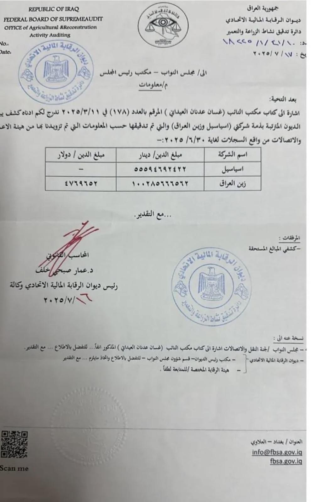 المورد نيوز/ كشفت وثيقة صادرة عن ديوان الرقابة المالية، عن مجموع الديون المترتبة على شركتي الاتصالات "اسياسيل وزين العراق"، حيث تجاوزت الـ155 مليار دينار.