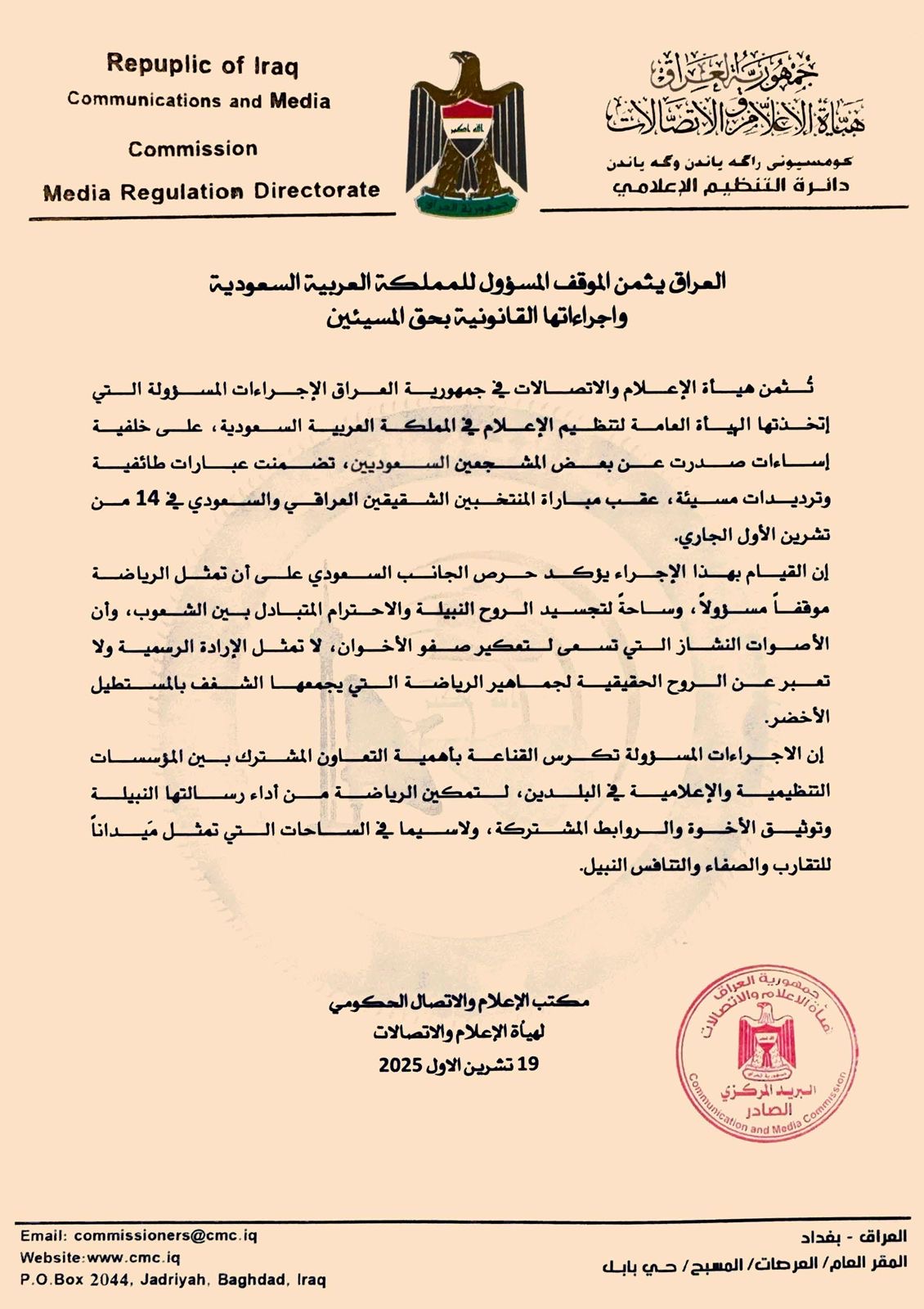 هيأة الإعلام والاتصالات تثمن موقف الرياض في التصدي للتجاوزات المسيئة بعد مب
