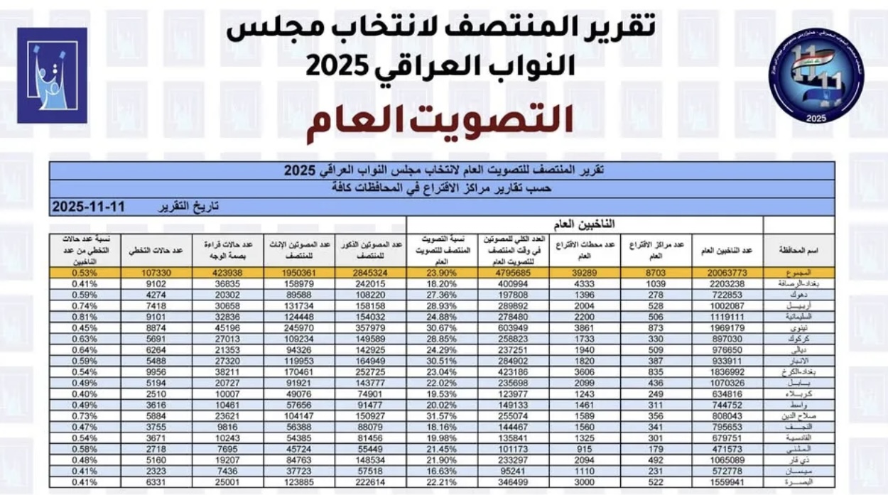 تنشر (المورد نيوز)، اليوم الثلاثاء، تقرير المنتصف لانتخابات البرلمان العراقي في التصويت العام، فيما بلغت نسبة التصويت 23.90 بالمئة.