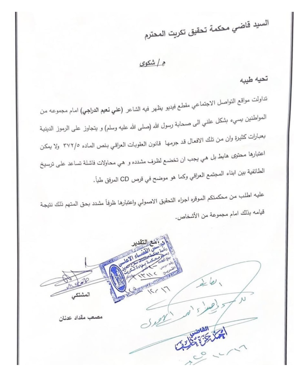 55 المورد نيوز/ أظهرت وثيقة، اليوم الثلاثاء، رفع أول دعوى رسمية في القضاء ضد الشاعر علي نعيم الدراجي، من قبل محام تكريتي، قال في عريضة الدعوى إن ما قاله الشاعر إساءة لصحابة النبي محمد والقضية لا يمكن اعتبارها محتوى هابطا، بل هي تجاوز على الرموز الدينية أمام مجموعة من الناس، مؤكداً أن قانون العقوبات العراقي يدين مثل هذه الأفعال.
