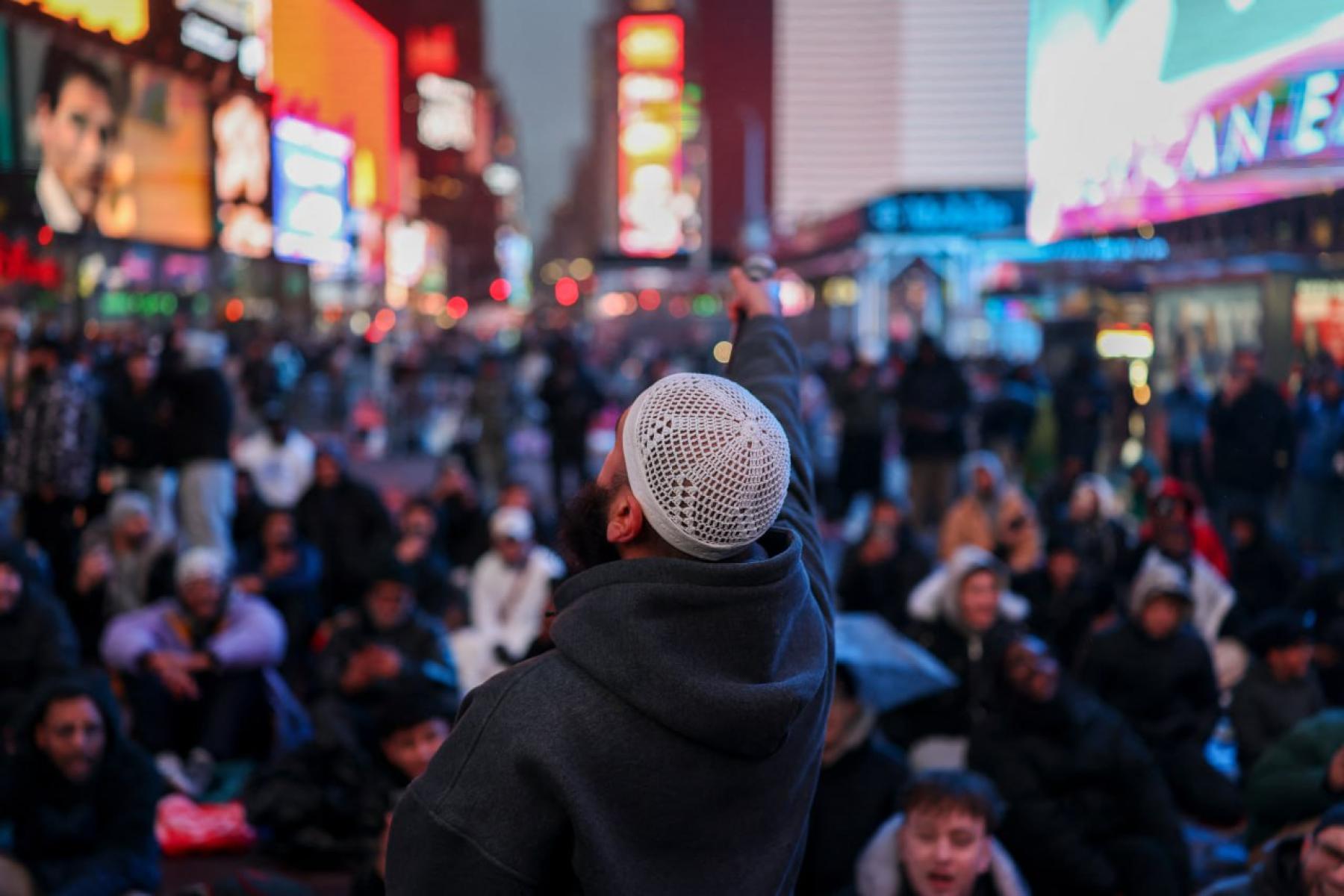 مسلمون يؤدون صلاة التراويح في ساحة تايمز سكوير في نيويورك